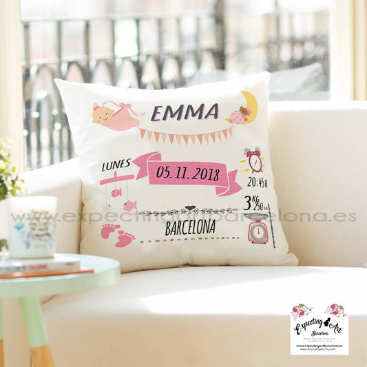 Cojín nacimiento de bebé personalizado con nombre y datos Bebé | Modelo Emma ribete| Funda desenfundable (35cm x 35cm 40cm x 40cm)