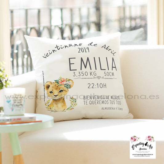 Cojín nacimiento de bebé personalizado con nombre y datos Bebé | Modelo baby leoncita| Funda desenfundable (35cm x 35cm 40cm x 40cm)