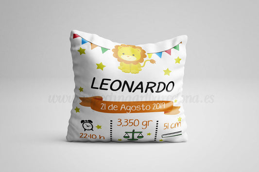 Cojín nacimiento de bebé personalizado con nombre y datos del bebé| Modelo datos Leoncito Leonardo | Funda desenfundable (35cm x 35cm 40cm x 40cm)