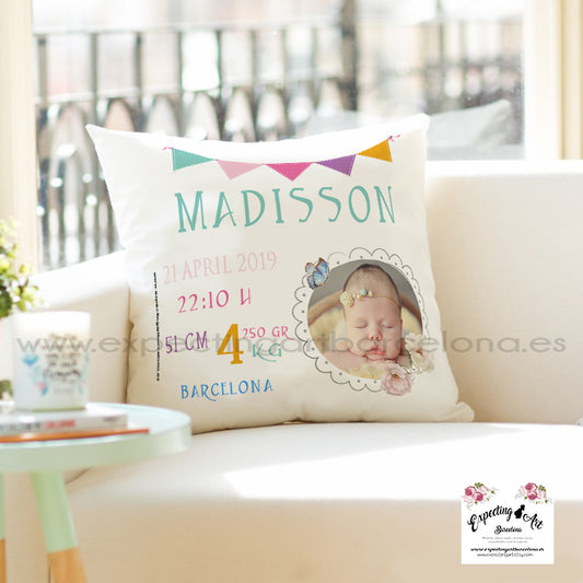 Cojín nacimiento de bebé personalizado con nombre, foto y datos Bebé | Modelo Madison | Funda desenfundable (35cm x 35cm 40cm x 40cm)