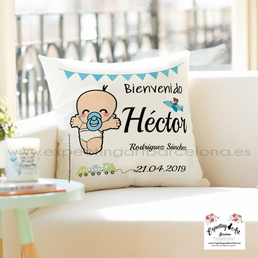 Cojín nacimiento de bebé personalizado con nombre| Modelo Bebé Héctor| Funda desenfundable (35cm x 35cm 40cm x 40cm)
