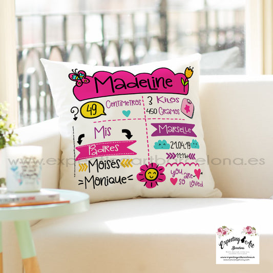 Cojín nacimiento de bebé personalizado con nombre y datos Bebé | Modelo Adara| Funda desenfundable (35cm x 35cm 40cm x 40cm)