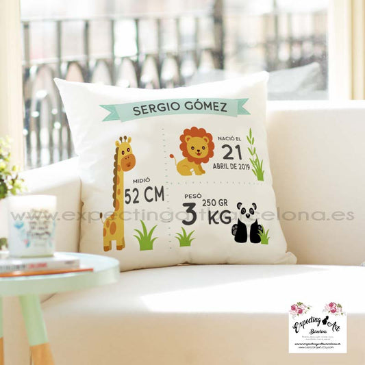 Cojín nacimiento de bebé personalizado con nombre y datos Bebé | Modelo animalitos zoo| Funda desenfundable (35cm x 35cm 40cm x 40cm)