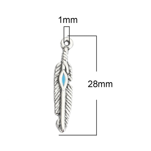 Colgante de Pluma de Aleación de Zinc en Plata Antigua con Esmalte Azul - Conjunto de 4 - 28mm x 5mm