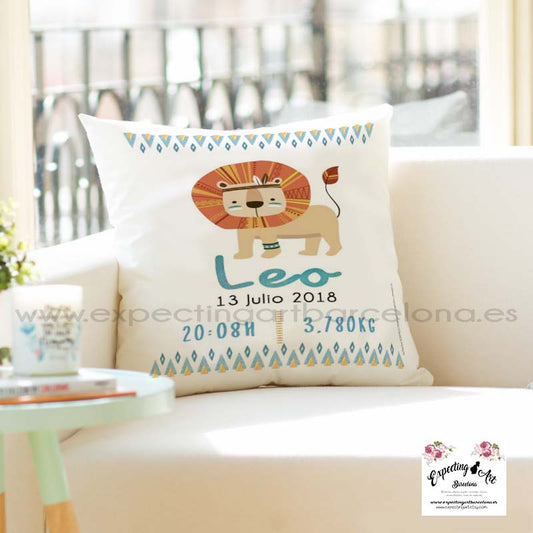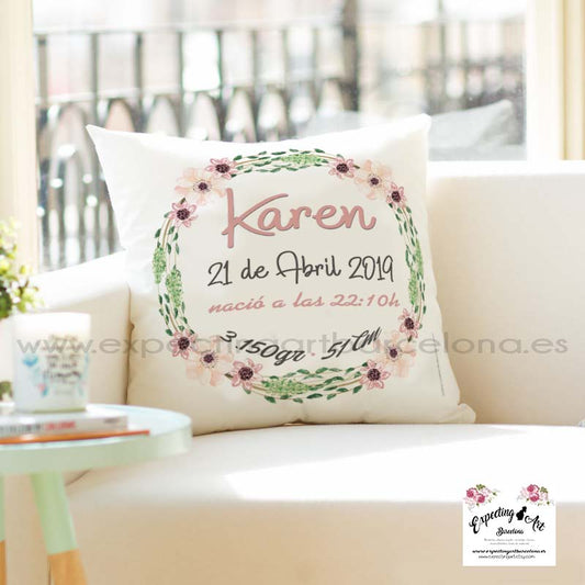 Cojín nacimiento de bebé personalizado con nombre y datos Bebé | Modelo Karen Flores | Funda desenfundable (35cm x 35cm 40cm x 40cm)