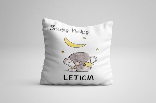 Cojín nacimiento de bebé personalizado con nombre y datos Bebé | Modelo Buenas noches elefantita| Funda desenfundable (35cm x 35cm 40cm x 40cm)