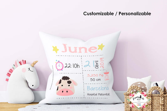 Cojín nacimiento de bebé personalizado con nombre y datos Bebé | Modelo vaquita June | Funda desenfundable (35cm x 35cm 40cm x 40cm)