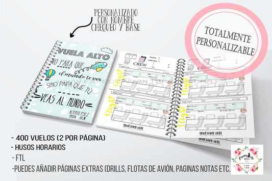 Agenda de vuelo para cabin crew personalizable. Modelo " Vuela alto para que el mundo te vea.."".