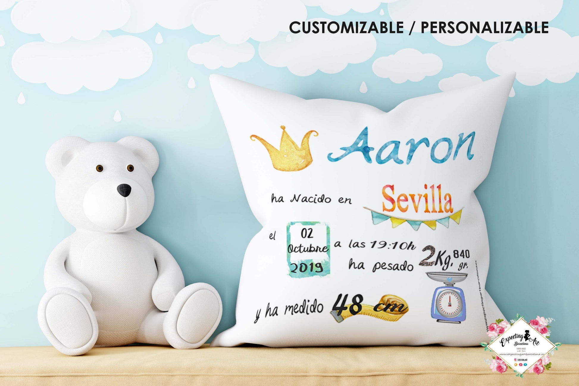 Cojín nacimiento de bebé personalizado con nombre y datos Bebé | Modelo Acuarela azul | Funda desenfundable (35cm x 35cm 40cm x 40cm)